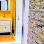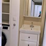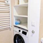 - à l'entrée : un coin toilette avec sèche-serviette, un wc, et un placard de rangement (aspirateur, table et fer à repasser).