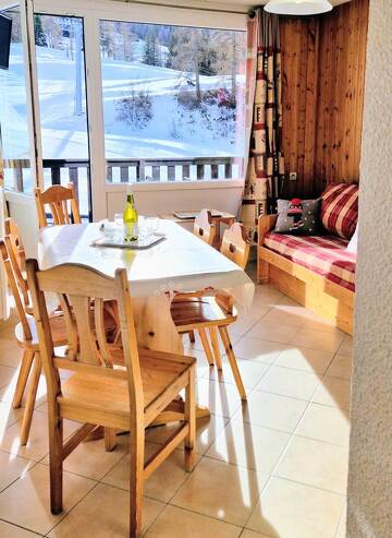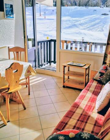 1) d'une pièce à vivre avec grande baie vitrée donnant sur un balcon, face aux pistes de ski, comprenant :