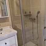 - une salle de bain avec douche à porte coulissante, meuble vasque avec tiroirs, armoire de toilette, sèche cheveux, sèche-serviettes