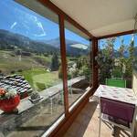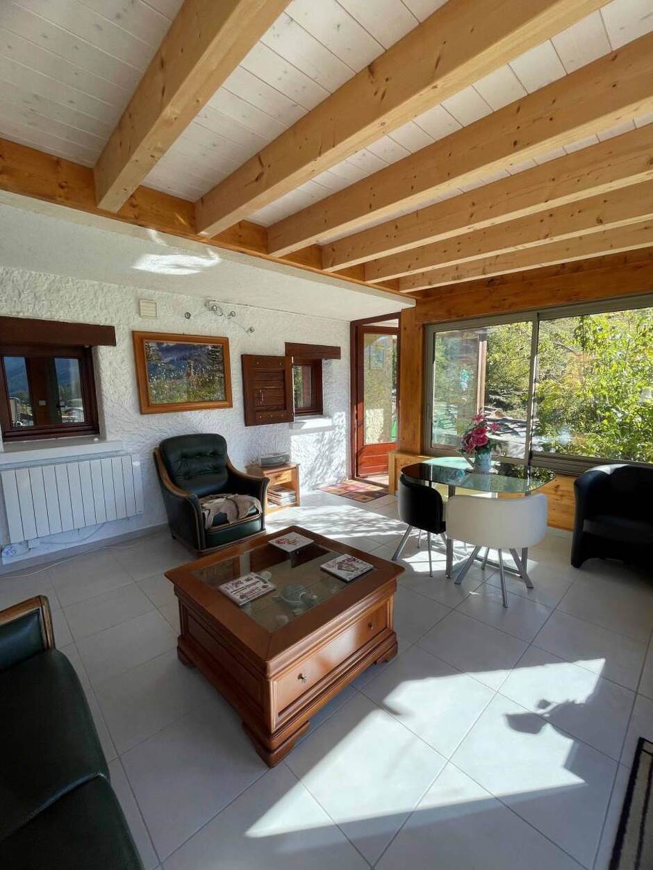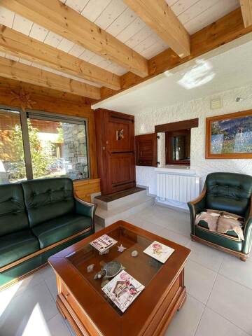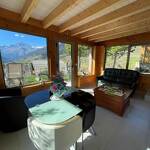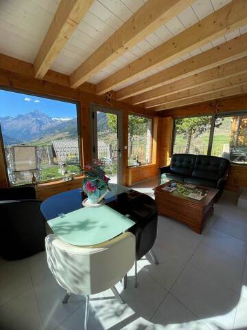 - Une véranda offrant une vue imprenable sur le village et la montagne, aussi agréable en hiver qu’en été. Elle est équipée de fauteuils et d’une table, parfaite pour partager vos meilleurs moments.
