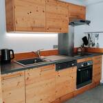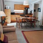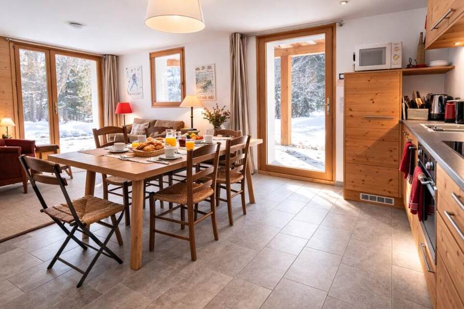 - une pièce de vie comprenant un coin séjour, canapé (convertible, 2 couchages), TV et un coin salle à manger avec cuisine équipée (four, lave-vaisselle, micro-onde, appareils à raclette et à fondue, cafetières à filtres et Nespresso)