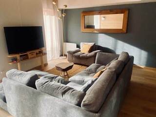 - un séjour / salle à manger avec un canapé en L, un grand fauteuil, une table pour 8 personnes et une TV connectée 4 K.