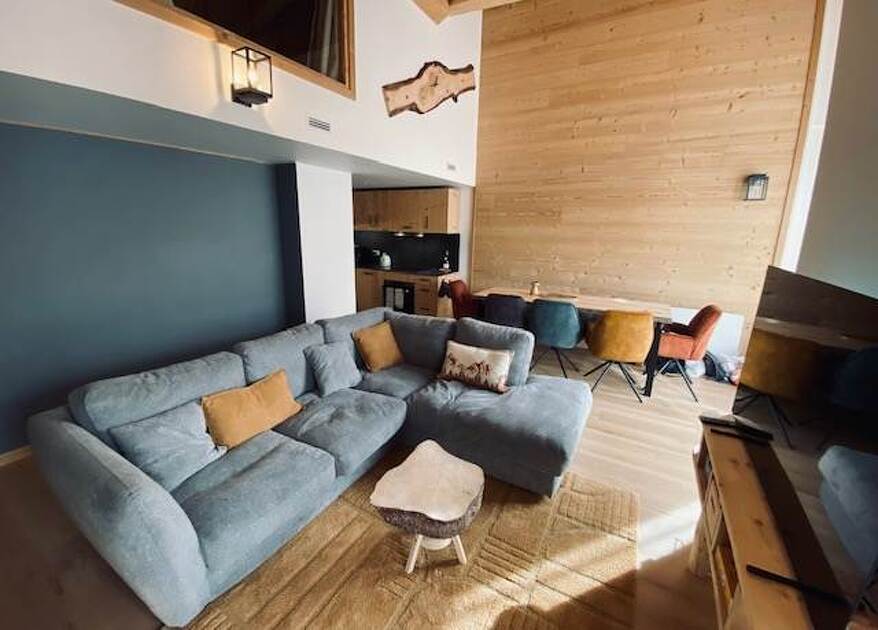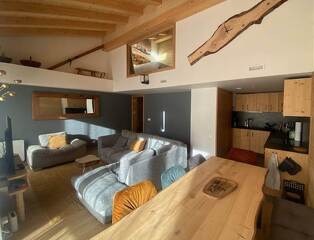 Réalisé dans des matériaux de qualité, cet appartement avec séjour cathédrale offre une belle ambiance de style loft / montagne.